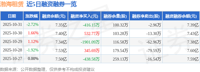 渤海租赁融资融券信息显示,融资方面,当日融资买入4284.91万元,融资偿还4701.06万元,融资净偿还416.15万元。融券方面,融券卖出9.94万股,融券偿还12.9万股,融券余量100.32万股,融券余额358.14万元。融资融券余额7.39亿元。