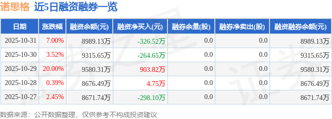 诺思格融资融券信息显示,融资方面,当日融资买入6197.11万元,融资偿还6523.64万元,融资净偿还326.52万元。融券方面,融券卖出0.0股,融券偿还0.0股,融券余量0.0股,融券余额0.0万元。融资融券余额8989.13万元。