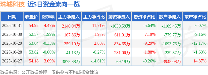 证券之星消息,截至2025年10月31日收盘,珠城科技(301280)报收于54.92元,上涨4.47%,换手率8.89%,成交量3.37万手,成交额1.83亿元。