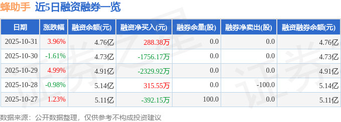 蜂助手融资融券信息显示,融资方面,当日融资买入4468.6万元,融资偿还4180.22万元,融资净买入288.38万元。融券方面,融券卖出0.0股,融券偿还0.0股,融券余量0.0股,融券余额0.0万元。融资融券余额4.76亿元。