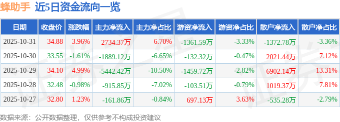 证券之星消息,截至2025年10月31日收盘,蜂助手(301382)报收于34.88元,上涨3.96%,换手率6.65%,成交量11.76万手,成交额4.08亿元。