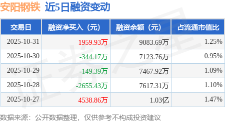 证券之星消息,10月31日,安阳钢铁(600569)融资买入4399.12万元,融资偿还2439.19万元,融资净买入1959.93万元,融资余额9083.69万元。