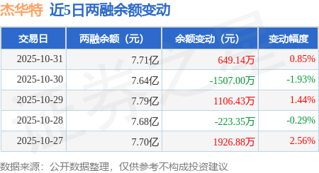 证券之星消息,10月31日,杰华特(688141)融资买入7053.46万元,融资偿还6410.64万元,融资净买入642.83万元,融资余额7.69亿元。