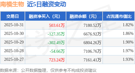 证券之星消息,10月31日,南模生物(688265)融资买入1388.72万元,融资偿还885.12万元,融资净买入503.61万元,融资余额7180.52万元。