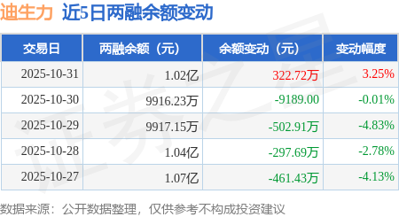 证券之星消息,10月31日,迪生力(603335)融资买入1571.65万元,融资偿还1248.94万元,融资净买入322.72万元,融资余额1.02亿元。