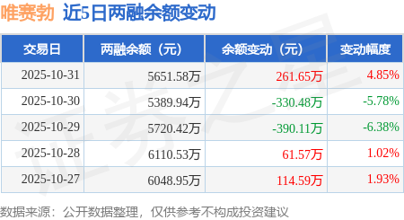 证券之星消息,10月31日,唯赛勃(688718)融资买入535.26万元,融资偿还273.62万元,融资净买入261.65万元,融资余额5651.58万元。