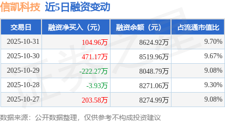 证券之星消息,10月31日,信凯科技(001335)融资买入335.71万元,融资偿还230.74万元,融资净买入104.96万元,融资余额8624.92万元,近20个交易日中有13个交易日出现融资净买入。