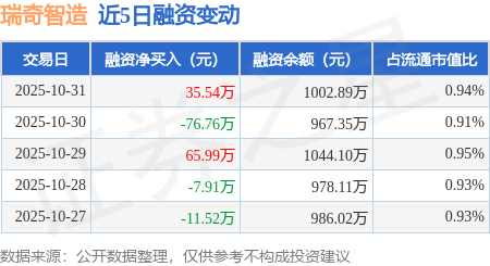 证券之星消息,10月31日,瑞奇智造(920781)融资买入39.72万元,融资偿还4.17万元,融资净买入35.54万元,融资余额1002.89万元,近20个交易日中有11个交易日出现融资净买入。