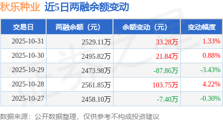 证券之星消息,10月31日,秋乐种业(920087)融资买入407.45万元,融资偿还374.17万元,融资净买入33.28万元,融资余额2529.11万元。