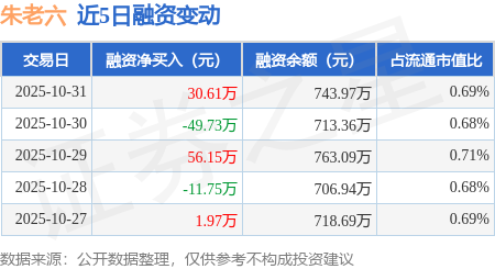 证券之星消息,10月31日,朱老六(920726)融资买入106.6万元,融资偿还75.99万元,融资净买入30.61万元,融资余额743.97万元。