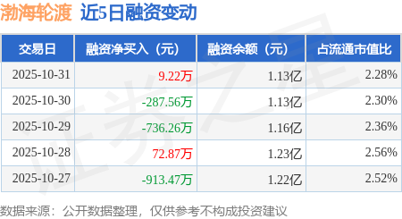 证券之星消息,10月31日,渤海轮渡(603167)融资买入694.07万元,融资偿还684.85万元,融资净买入9.22万元,融资余额1.13亿元。
