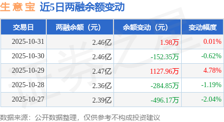 证券之星消息,10月31日,生 意 宝(002095)融资买入1632.82万元,融资偿还1630.86万元,融资净买入1.97万元,融资余额2.46亿元。