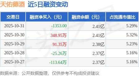 证券之星消息,10月31日,天佑德酒(002646)融资买入653.44万元,融资偿还653.57万元,融资净卖出0.14万元,融资余额2.41亿元。