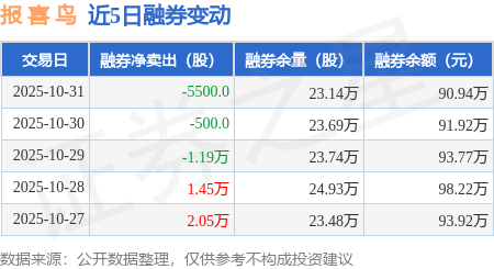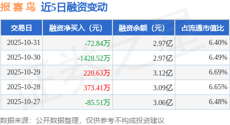 证券之星消息,10月31日,报 喜 鸟(002154)融资买入1306.65万元,融资偿还1379.49万元,融资净卖出72.84万元,融资余额2.97亿元。