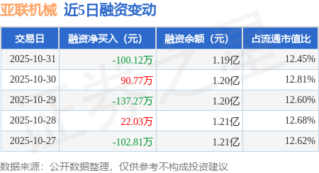 证券之星消息,10月31日,亚联机械(001395)融资买入247.7万元,融资偿还347.82万元,融资净卖出100.12万元,融资余额1.19亿元。