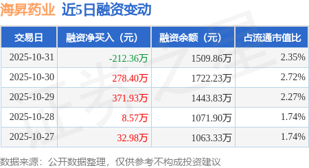证券之星消息,10月31日,海昇药业(920656)融资买入88.44万元,融资偿还300.81万元,融资净卖出212.36万元,融资余额1509.86万元,近20个交易日中有11个交易日出现融资净买入。