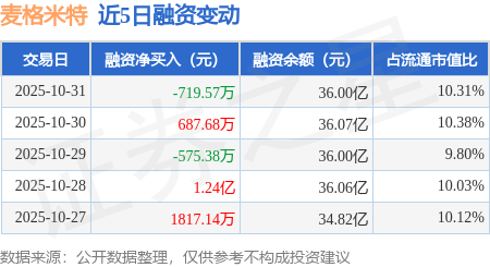 证券之星消息,10月31日,麦格米特(002851)融资买入2.81亿元,融资偿还2.88亿元,融资净卖出719.57万元,融资余额36.0亿元。
