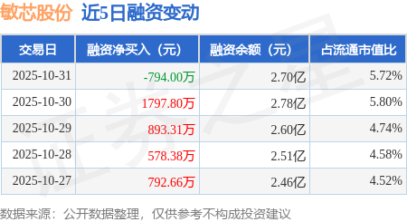 证券之星消息,10月31日,敏芯股份(688286)融资买入2457.59万元,融资偿还3251.59万元,融资净卖出794.0万元,融资余额2.7亿元,近20个交易日中有11个交易日出现融资净买入。