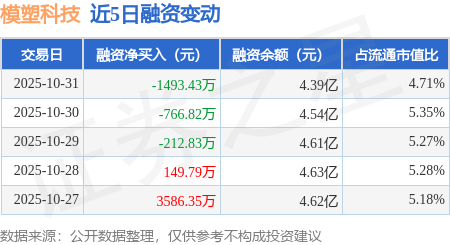 证券之星消息,10月31日,模塑科技(000700)融资买入6919.68万元,融资偿还8413.11万元,融资净卖出1493.43万元,融资余额4.39亿元。