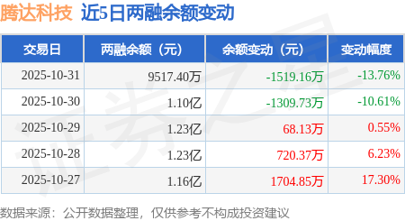 证券之星消息,10月31日,腾达科技(001379)融资买入1609.19万元,融资偿还3128.36万元,融资净卖出1519.16万元,融资余额9517.4万元。