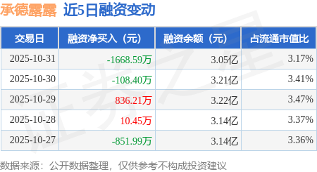 证券之星消息,10月31日,承德露露(000848)融资买入1986.36万元,融资偿还3654.94万元,融资净卖出1668.59万元,融资余额3.05亿元,近20个交易日中有11个交易日出现融资净买入。