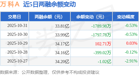 证券之星消息,10月31日,万 科A(000002)融资买入5818.9万元,融资偿还7488.93万元,融资净卖出1670.03万元,融资余额33.58亿元。