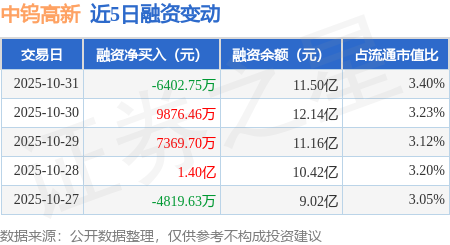 证券之星消息,10月31日,中钨高新(000657)融资买入4.09亿元,融资偿还4.73亿元,融资净卖出6402.75万元,融资余额11.5亿元。