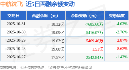 证券之星消息,10月31日,中航沈飞(600760)融资买入1.22亿元,融资偿还1.98亿元,融资净卖出7667.48万元,融资余额18.26亿元。