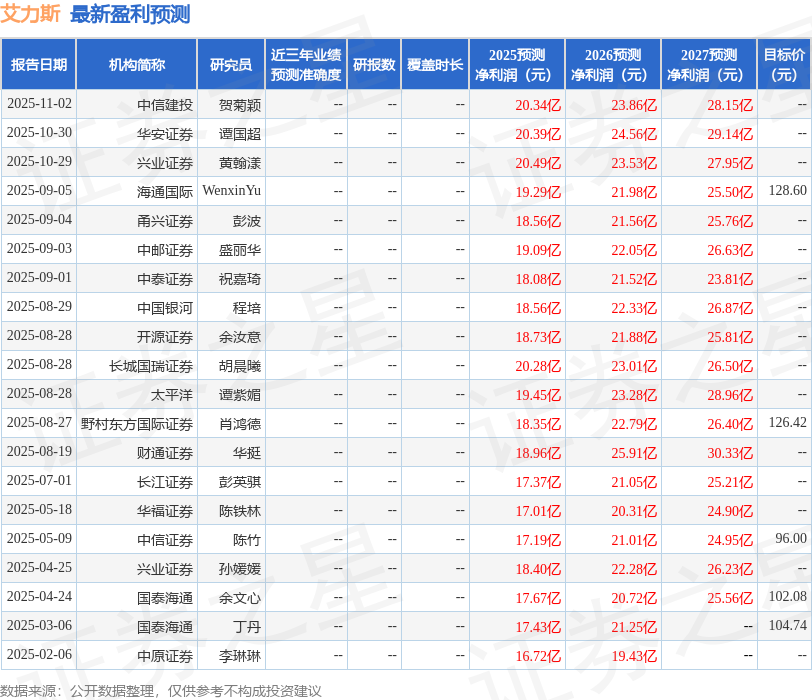 最新盈利预测明细如下: