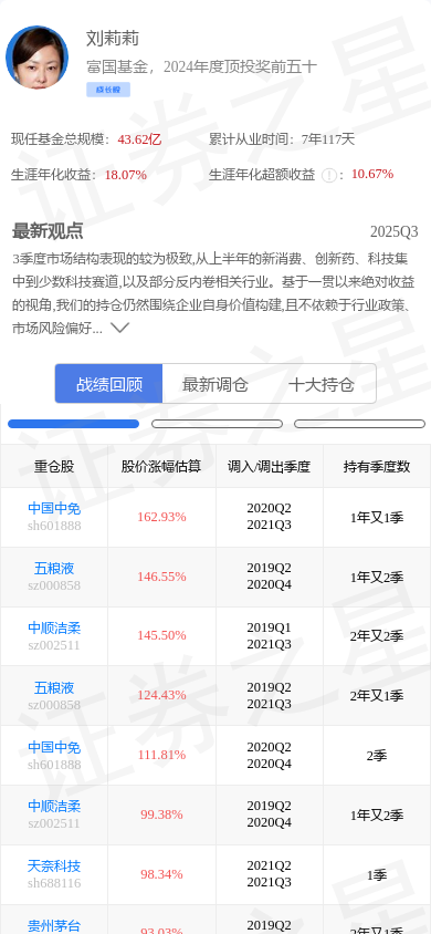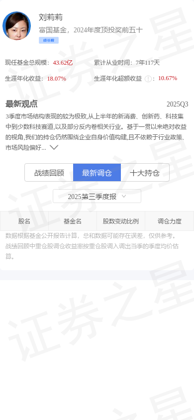 可在证星研究院详细查看刘莉莉战绩和分析师对基金持仓的增减仓公司的业绩预测。(更多特色估值数据尽在证星研究院)