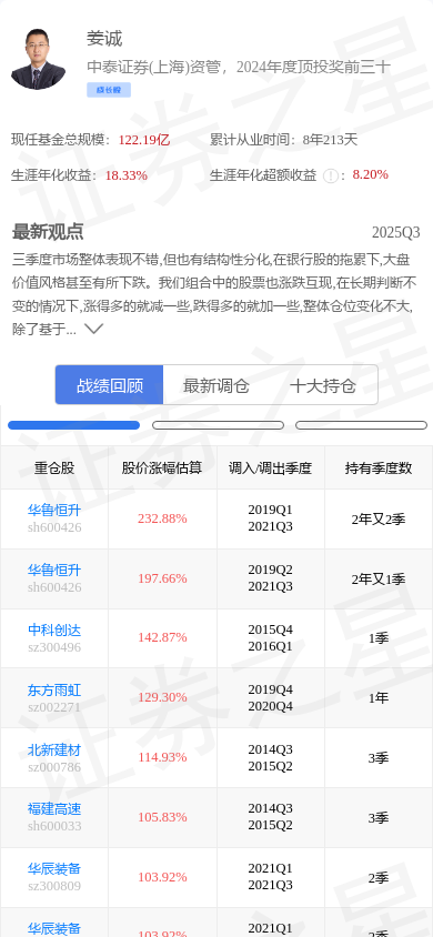 思瑞浦(688536)是基金大佬姜诚的重仓股。,其在整个职业生涯内年化收益高达18.33%。姜诚管理的中泰兴诚价值一年持有混合A基金在2024年4季度调入思瑞浦,已连续持有1年又0个季度,持有期间的估算收益率达到33.88%。(以上数据经过后复权近似计算)姜诚的大佬持仓 - 战绩回顾截图如下: