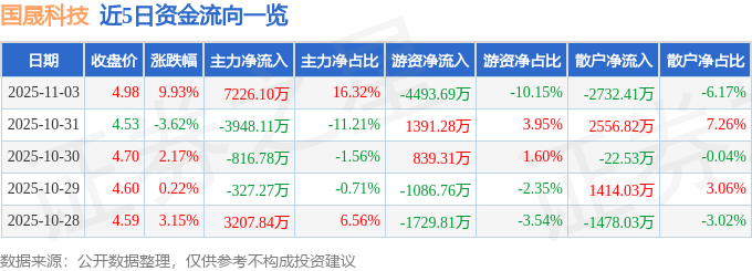 证券之星消息,截至2025年11月3日收盘,国晟科技(603778)报收于4.98元,上涨9.93%,涨停,换手率14.62%,成交量93.96万手,成交额4.47亿元。