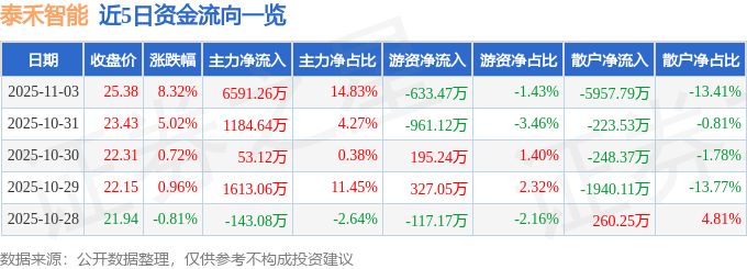 证券之星消息,截至2025年11月3日收盘,泰禾智能(603656)报收于25.45元,上涨8.62%,换手率11.03%,成交量20.23万手,成交额5.11亿元。