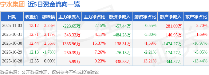 证券之星消息,截至2025年11月3日收盘,宁水集团(603700)报收于13.05元,上涨2.68%,换手率4.56%,成交量9.19万手,成交额1.2亿元。