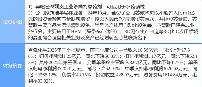 证券之星消息,百傲化学11月3日涨停收盘,收盘价32.97元。该股于13点36分涨停,2次打开涨停,截止收盘封单资金为3133.16万元,占其流通市值0.13%。