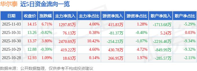 证券之星消息,截至2025年11月3日收盘,华尔泰(001217)报收于14.22元,上涨7.24%,换手率8.06%,成交量26.48万手,成交额3.73亿元。