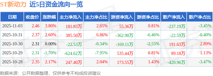 证券之星消息,截至2025年11月3日收盘,ST新动力(300152)报收于2.5元,上涨5.49%,换手率5.25%,成交量37.4万手,成交额9188.69万元。
