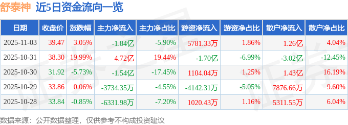 证券之星消息,截至2025年11月3日收盘,舒泰神(300204)报收于39.59元,上涨3.37%,换手率19.56%,成交量88.76万手,成交额35.0亿元。