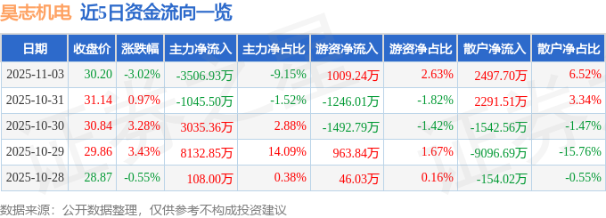 证券之星消息,截至2025年11月3日收盘,昊志机电(300503)报收于30.17元,下跌3.11%,换手率6.27%,成交量15.11万手,成交额4.56亿元。