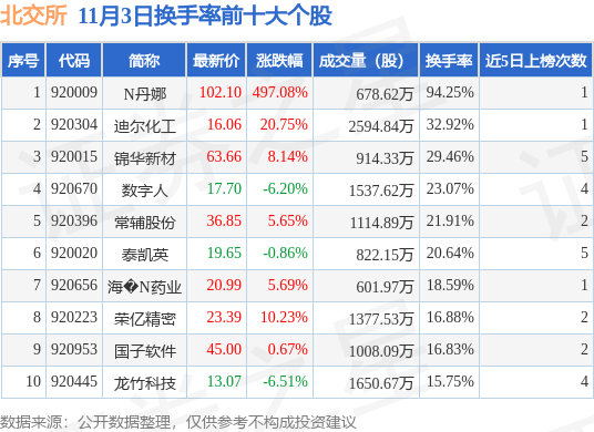 当日北交所换手率前10大个股中7只个股收涨,平均涨幅78.32%,其中N丹娜(920009)以换手率94.25%排第一,7只个股近5个交易日中多次上榜。