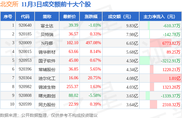 当日北交所成交额前10大个股中8只个股收涨,平均涨幅66.83%,其中富士达(920640)以成交额9.83亿元排第一。从主力资金流入看,成交额前10大个股中有6只个股呈现主力资金净流入。