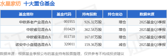 根据2025基金Q3季报公募基金重仓股数据,重仓该股的公募基金共4家,其中持有数量最多的公募基金为中欧基金的中欧养老产业混合A。中欧养老产业混合A目前规模为16.52亿元,最新净值2.9633(10月31日),较上一交易日上涨1.07%,近一年上涨12.1%。该公募基金现任基金经理为许文星。许文星在任的基金产品包括:中欧创业板两年定开混合A,管理时间为2020年7月16日至今,期间收益率为-2.65%;中欧睿见混合A,管理时间为2020年11月6日至今,期间收益率为-8.12%;中欧睿泽混合A,管理时间为2021年9月23日至今,期间收益率为-23.78%。