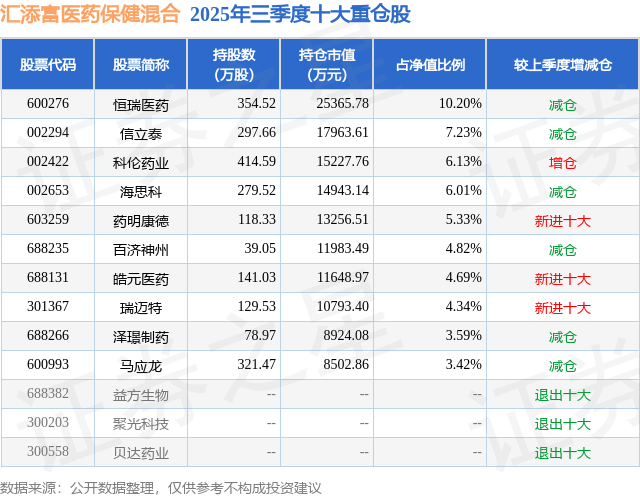 根据2025基金Q3季报公募基金重仓股数据,重仓该股的公募基金共6家,其中持有数量最多的公募基金为汇添富基金的汇添富医药保健混合。汇添富医药保健混合目前规模为24.86亿元,最新净值2.049(10月31日),较上一交易日上涨3.33%,近一年上涨27.58%。该公募基金现任基金经理为郑磊。郑磊在任的基金产品包括:汇添富中盘积极成长混合A,管理时间为2020年3月13日至今,期间收益率为46.42%;汇添富医疗积极成长一年持有混合A,管理时间为2020年8月21日至今,期间收益率为-23.4%;汇添富成长领先混合A,管理时间为2021年12月10日至今,期间收益率为17.0%。