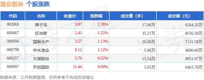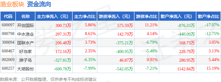 从资金流向上来看,当日渔业板块主力资金净流入48.08万元,游资资金净流出552.96万元,散户资金净流入504.89万元。渔业板块个股资金流向见下表: