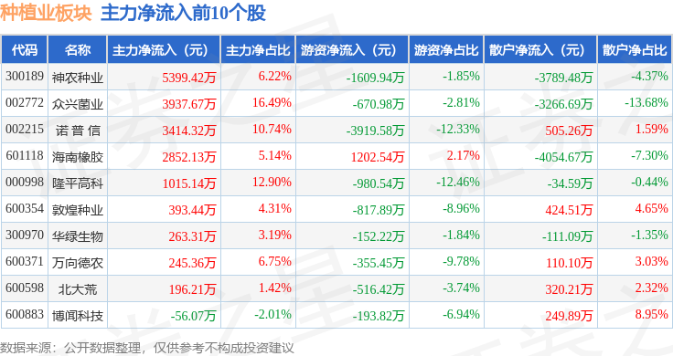 从资金流向上来看,当日种植业板块主力资金净流入9386.8万元,游资资金净流出5376.76万元,散户资金净流出4009.97万元。种植业板块个股资金流向见下表: