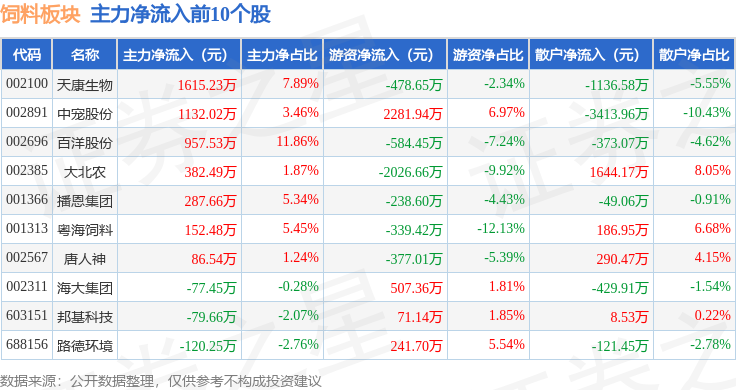 从资金流向上来看,当日饲料板块主力资金净流出2822.46万元,游资资金净流入1556.72万元,散户资金净流入1265.74万元。饲料板块个股资金流向见下表: