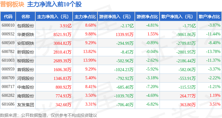 从资金流向上来看,当日普钢板块主力资金净流入3.68亿元,游资资金净流出2.82亿元,散户资金净流出8547.89万元。普钢板块个股资金流向见下表: