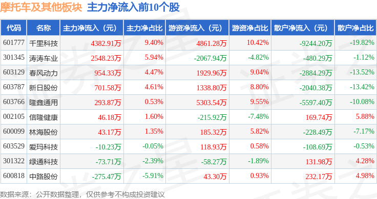 从资金流向上来看,当日摩托车及其他板块主力资金净流入3534.9万元,游资资金净流入1.28亿元,散户资金净流出1.64亿元。摩托车及其他板块个股资金流向见下表: