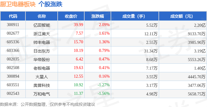 证券之星消息,11月3日厨卫电器板块较上一交易日上涨0.39%,亿田智能领涨。当日上证指数报收于3976.52,上涨0.55%。深证成指报收于13404.06,上涨0.19%。厨卫电器板块个股涨跌见下表: