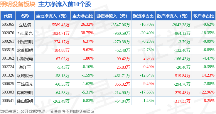 从资金流向上来看,当日照明设备板块主力资金净流入6826.1万元,游资资金净流出4870.09万元,散户资金净流出1956.01万元。照明设备板块个股资金流向见下表: